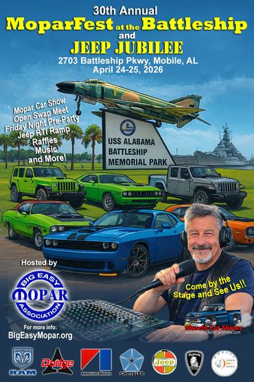 The 30th Annual MOPARFEST at the Battleship and JEEP JUBILEE is almost here! Make your plans to attend this timeless event! With music, prizes, 50/50, Swap Meet, and more! For information on the show, click the Big Easy Mopar Association tab below.