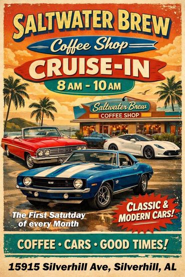 The First Saturday of Every Month- in Silverhill, AL, at the Saltwater Brew Coffee Shop they hold a monthly Cruise-In!! It starts at 8am- with an award for the coffee shop pick- door prizes- music-